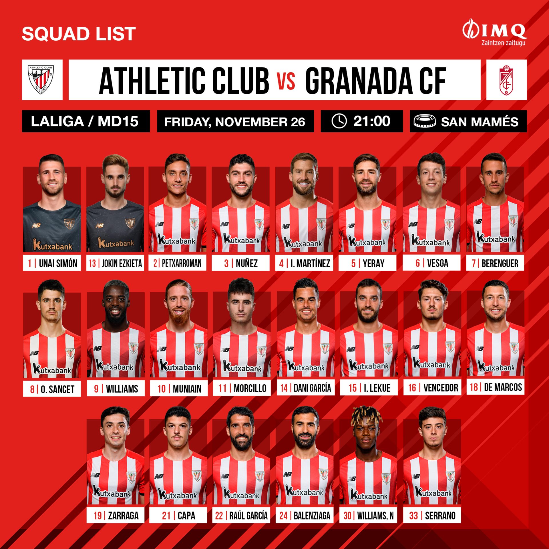 Marcelino has named a 22-man squad to face Granada CF. Bilbao Athletic forward Nico Serrano is back in the list. Striker Asier Villalibre is back on the sidelines after picking up an injury against Levante UD, he joins long-term absentees Dani Vivian, Yuri Berchiche and Peru Nolaskoain.