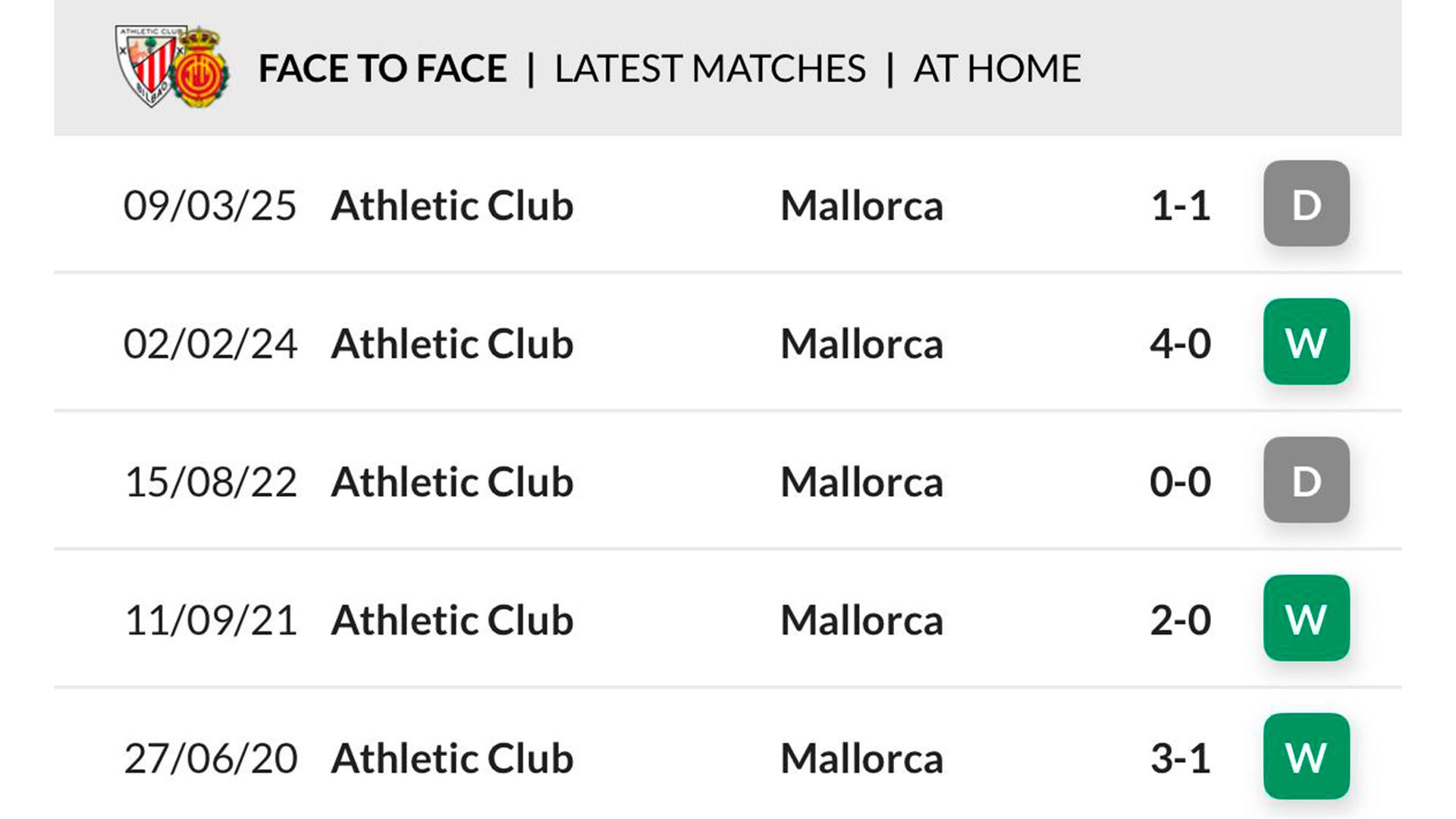 Athletic have won three and drawn two of their five most recent clashes with Mallorca at The Cathedral.