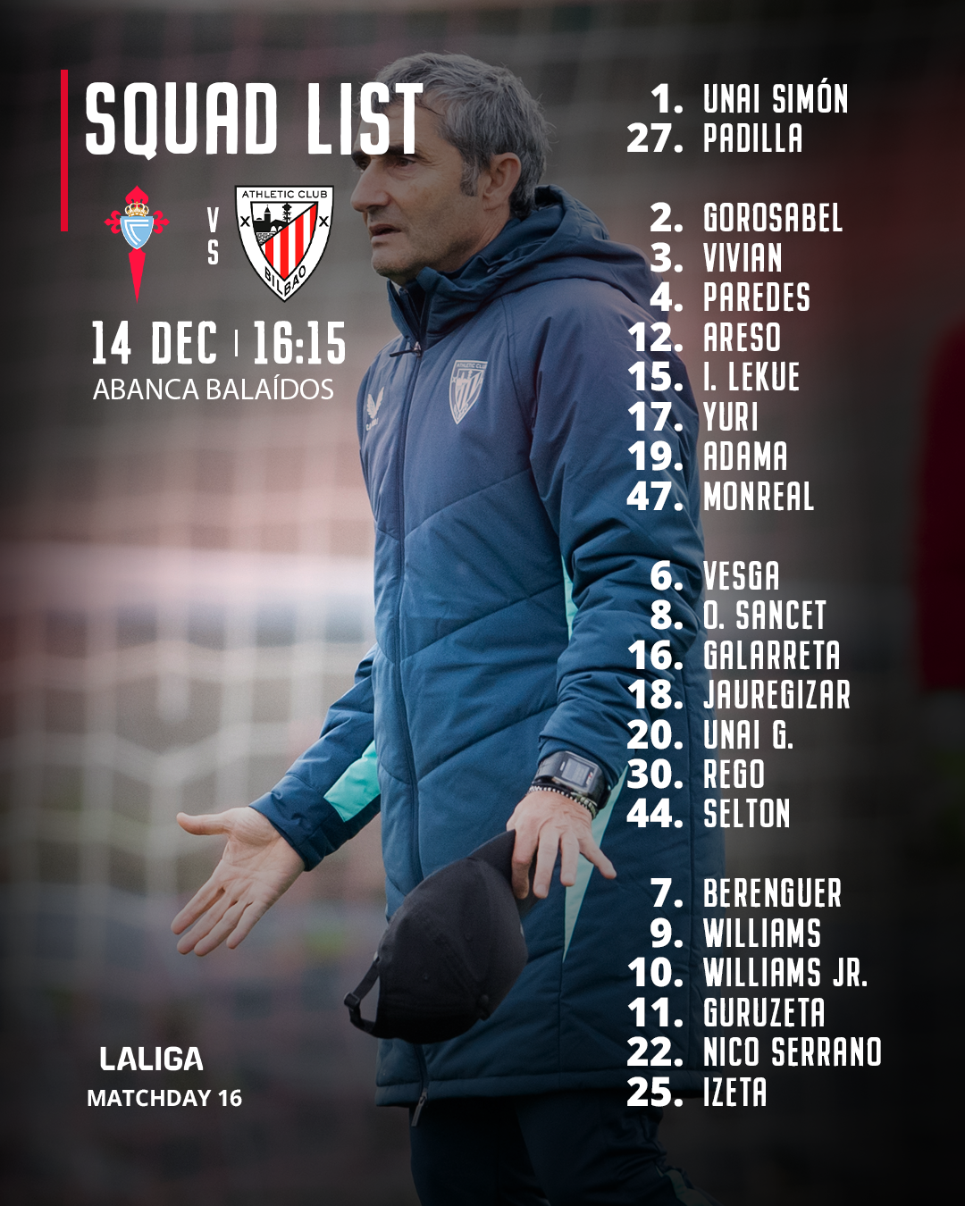 Squad list: RC Celta vs Athletic Club (LaLiga 2025-26 MD16)