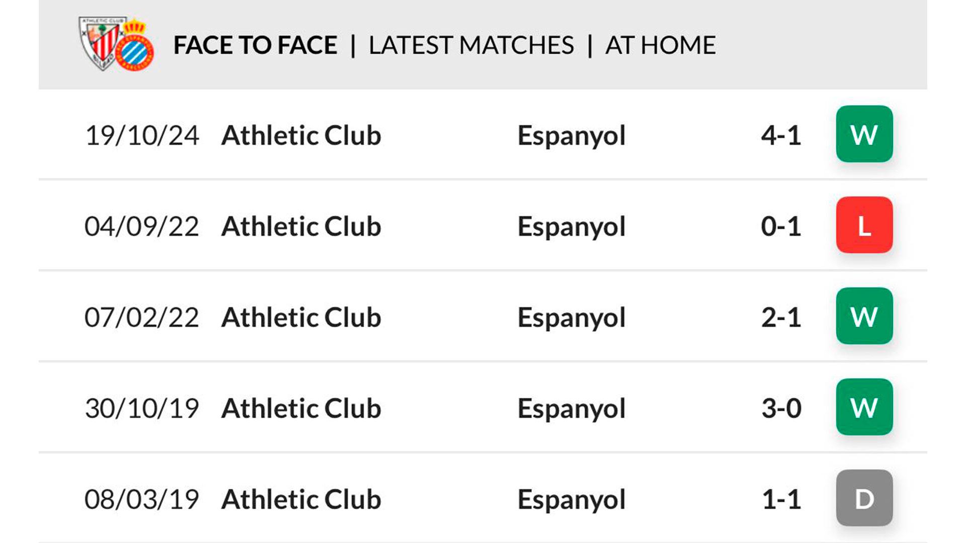 Athletic's recent home record against Los Pericos is strong. Espanyol's five latest visits to Bilbao have produced three wins, a draw and a loss for the Lions.