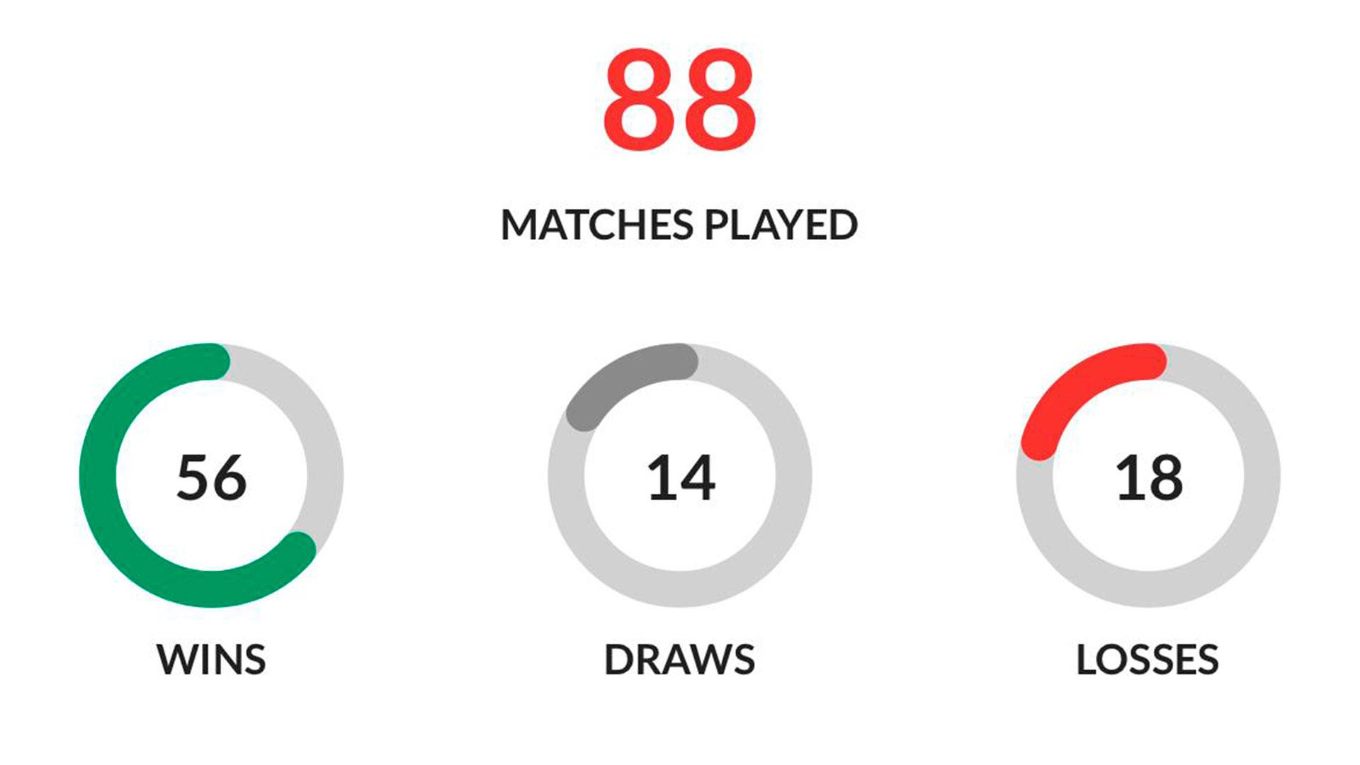 We've met 88 times in Bilbao, with the Zurigorri registering 56 victories, 14 draws and 18 losses.