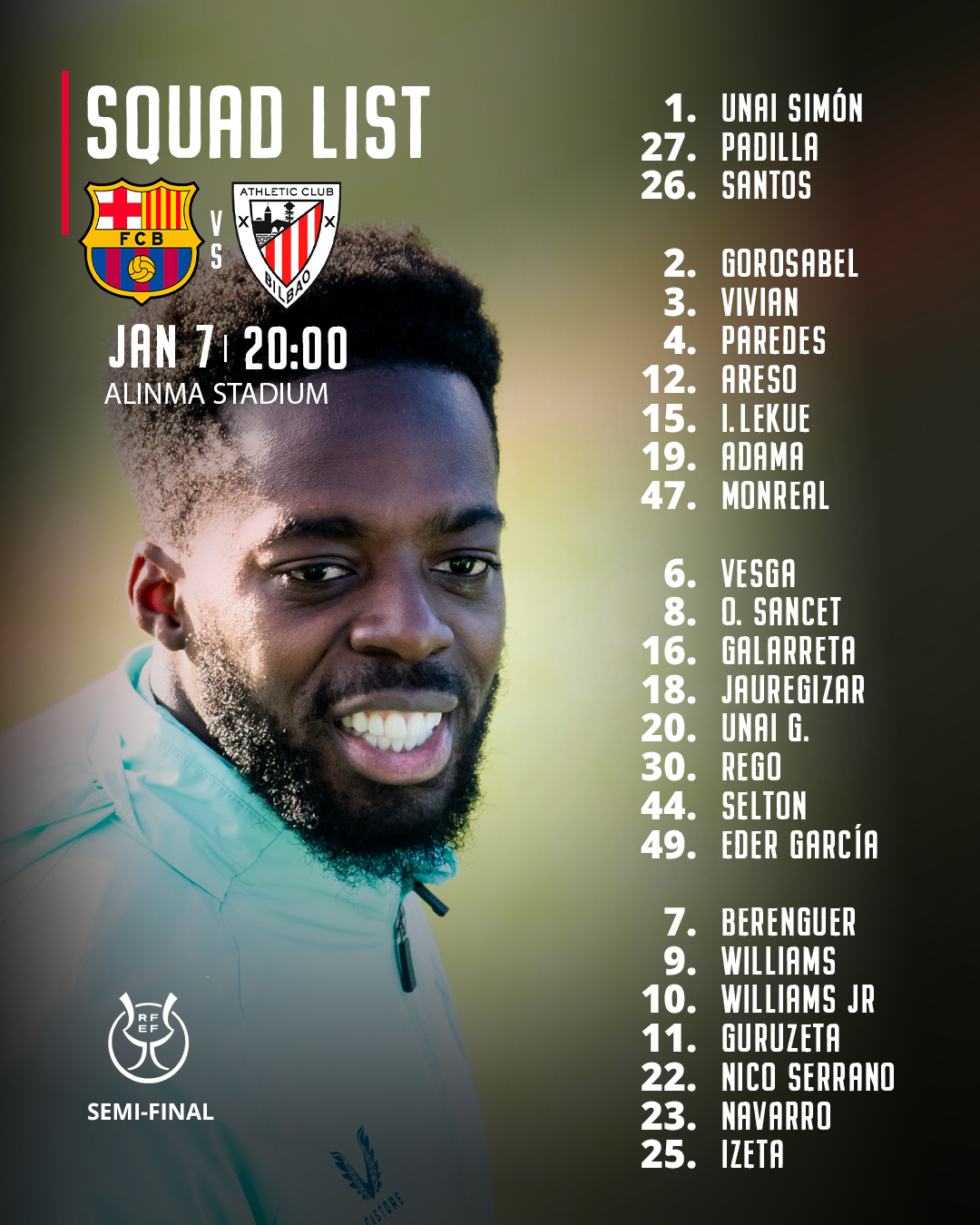 Squad list: FC Barcelona vs Athletic Club (2025/26 Supercopa semi-final)