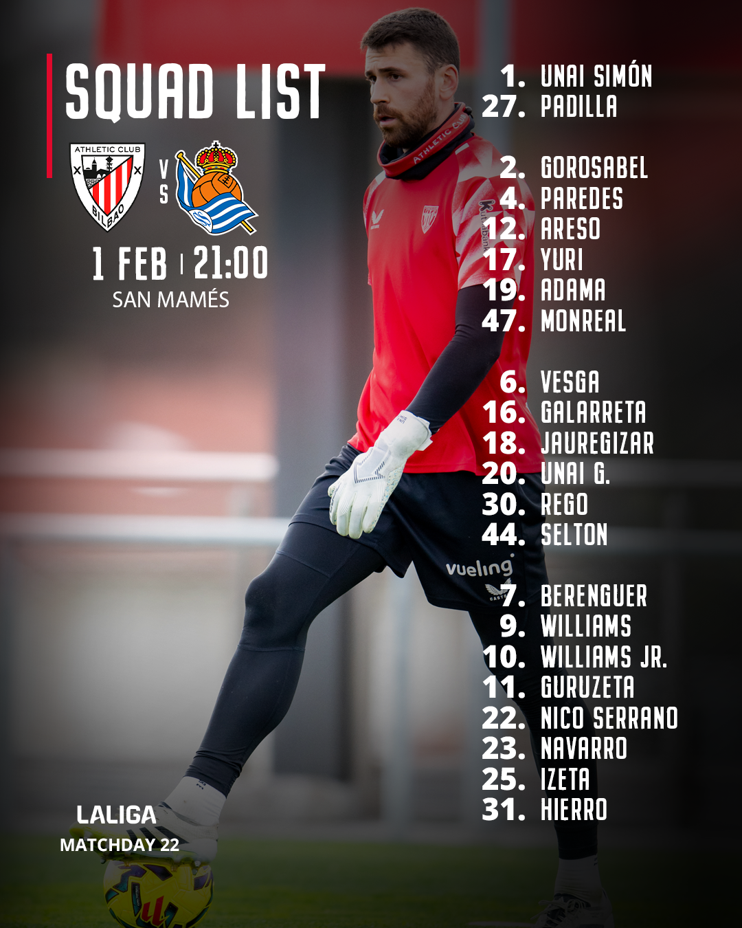 Squad list: Athletic Club vs Real Sociedad (LaLiga 2025/26 MD22)