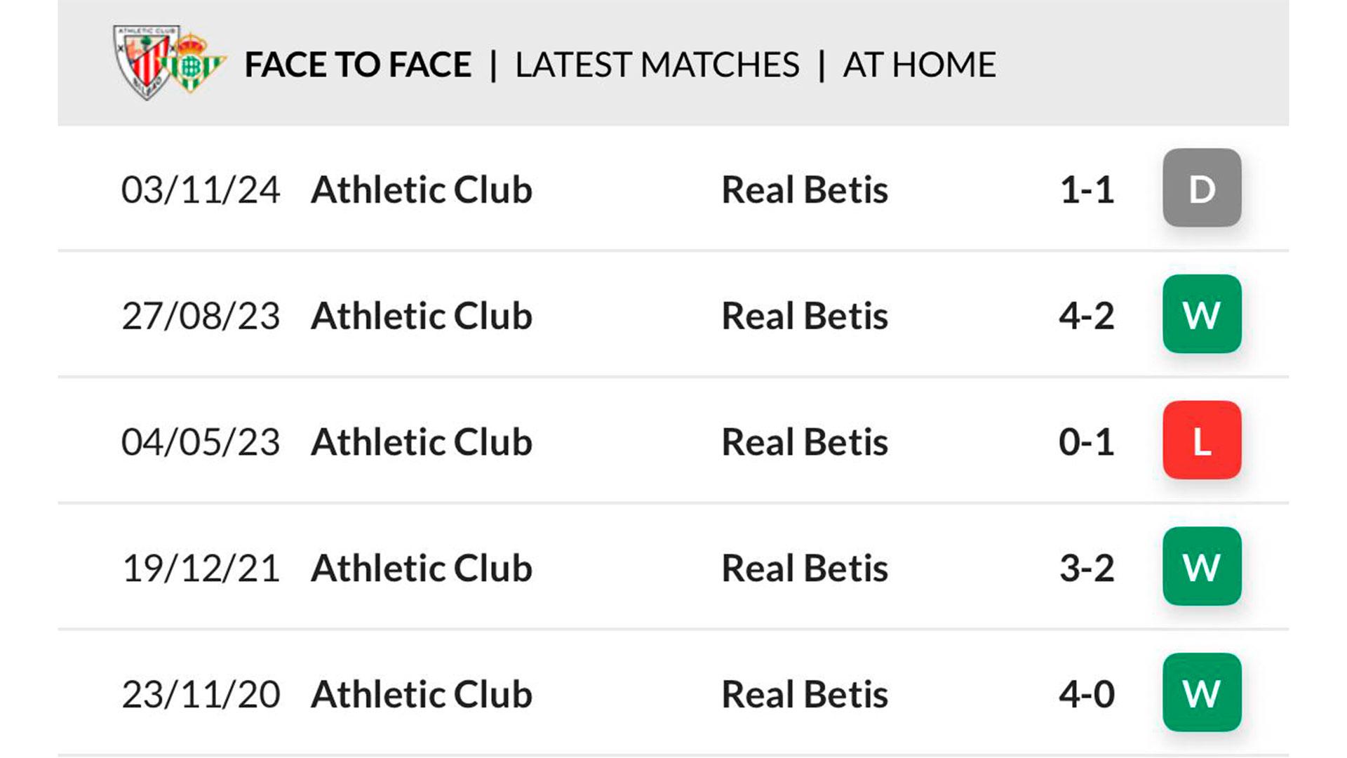 Athletic have done well against the Sevilla-based outfit in recent years. From Betis' last five visits to Bilbao, we've won five times, drawn once and lost once.