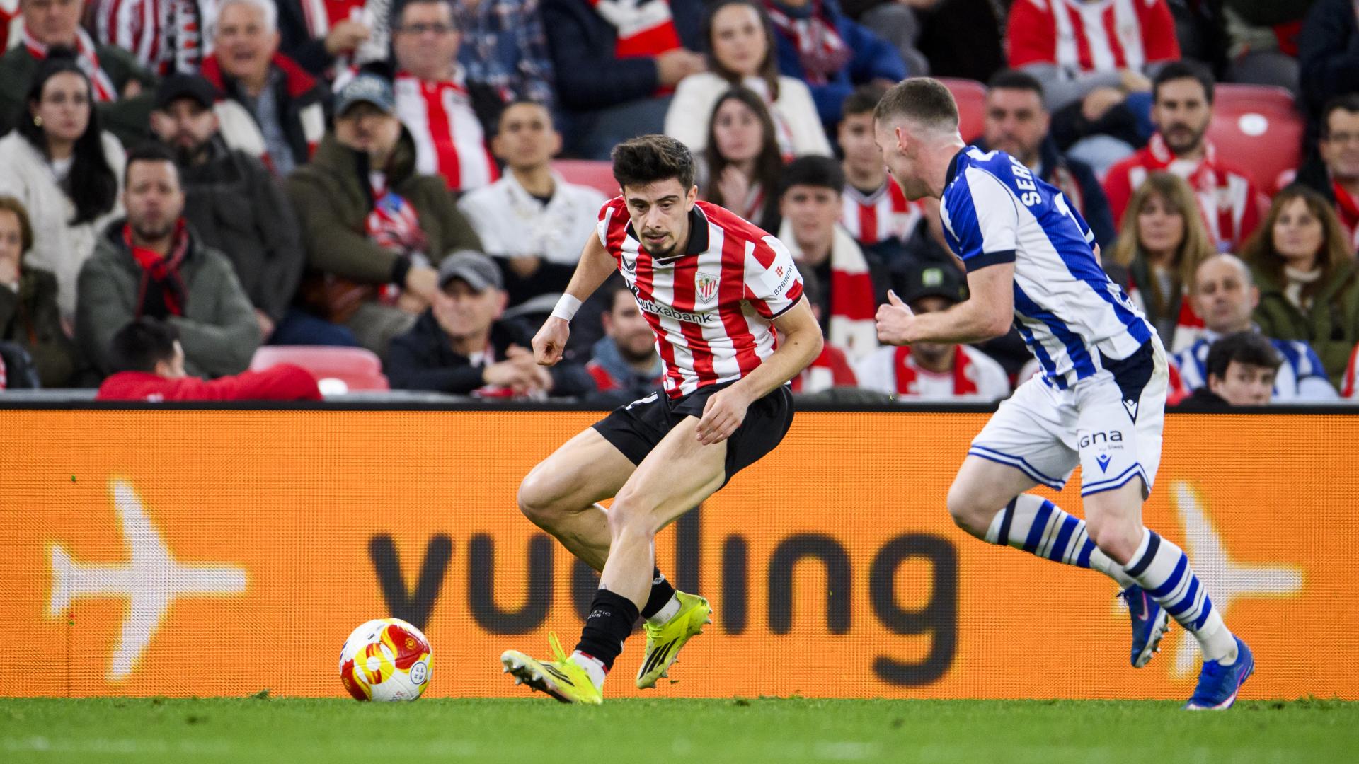 Los bilbaínos, espoleados de salida, marcaron el ritmo primero. De hecho, la primera ocasión fue suya. Una internada de Lekue con caño y centro a Guruzeta que sujetó Remiro. Sin embargo, la Real tuvo de seguida una más clara, con una ruptura de Pablo Marín, que se plantó ante el entonado Alex Padilla y el guardameta se sacó la primera de las dos grandes paradas de la noche.