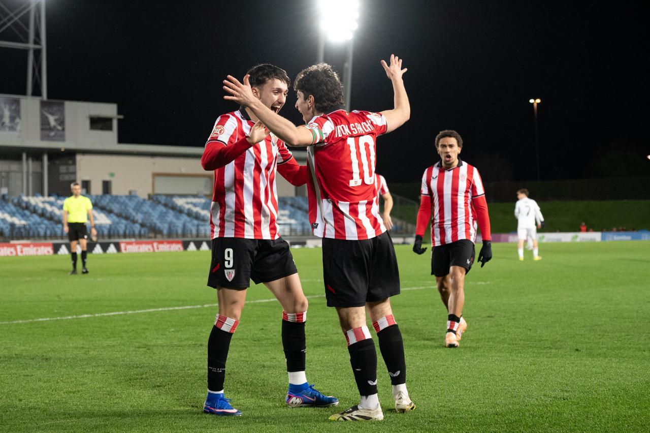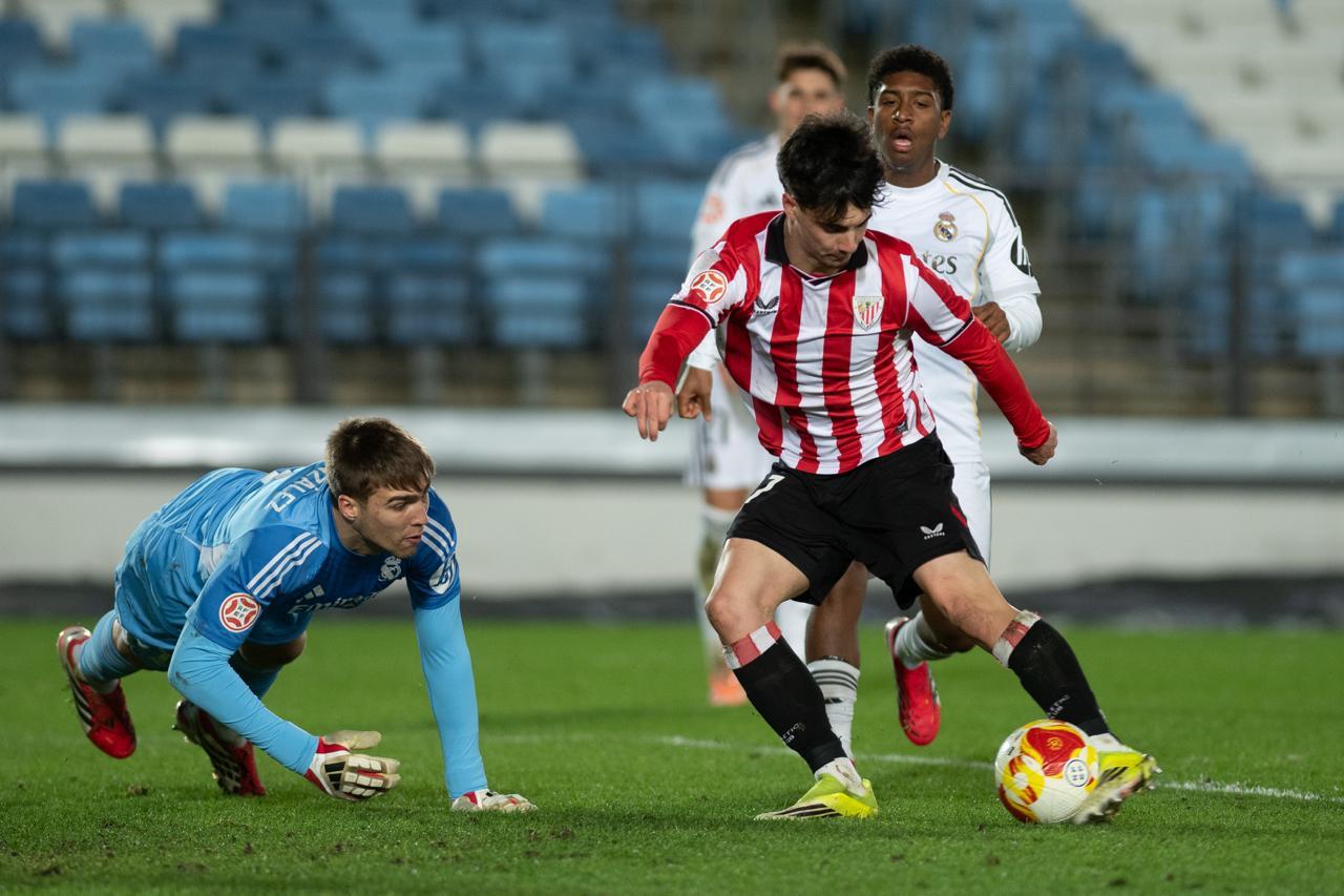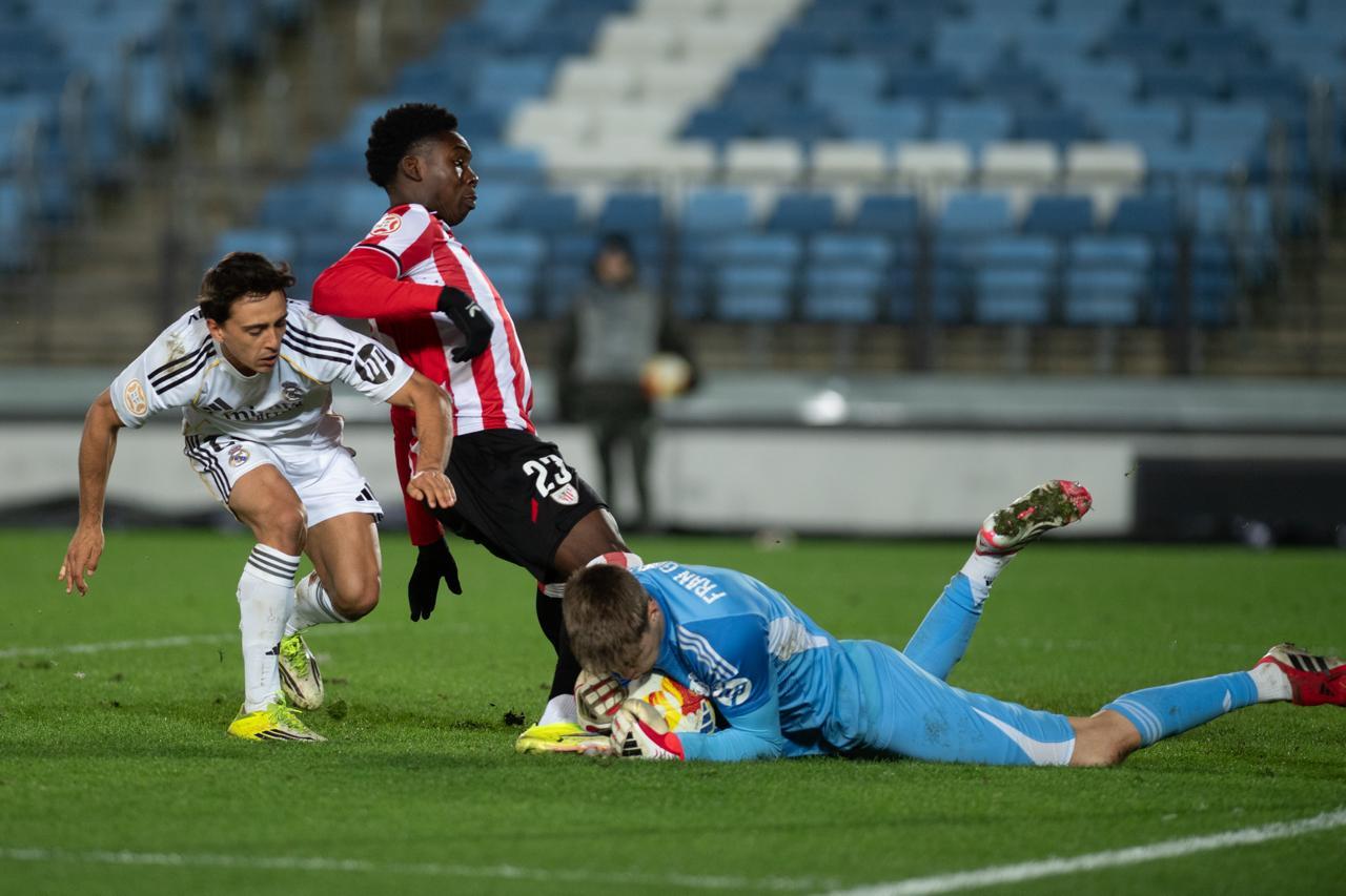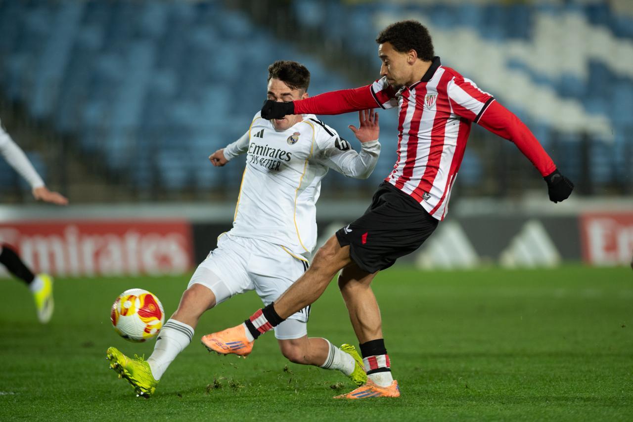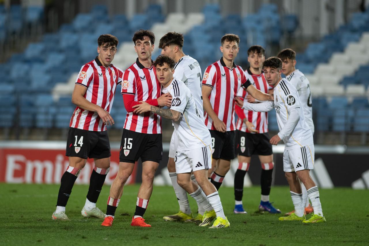 El Bilbao Athletic salió al césped del Alfredo Di Stéfano con un ritmo vertiginoso y fruto de la presión inicial, el encuentro comenzó de cara para los de Jokin Aranbarri. Eder García mandó un baló en profundidad para Gift, que cedió perfectamente un balón a la media luna donde apareció Ibon Sánchez para mandar un zurdazo a las redes madridistas. No obstante, en la primera jugada peligrosa para los locales, Pol Fortuny igualó la contienda después de recoger un rechace de una parada de Mikel Santos. El infortunio se cebó con el Bilbao Athletic, ya que tuvo que realizar un doble cambio durante la primera parte debido a las molestias de Duñabeitia e Ibon Sánchez. El cambio de este último dio pie para que Efe Korkut gozara de sus primeros minutos con la camiseta rojiblanca. Huestamendia tuvo una ocasión muy clara para hacer el segundo, pero Joan Martín sacó el balón sobre la línea de gol.