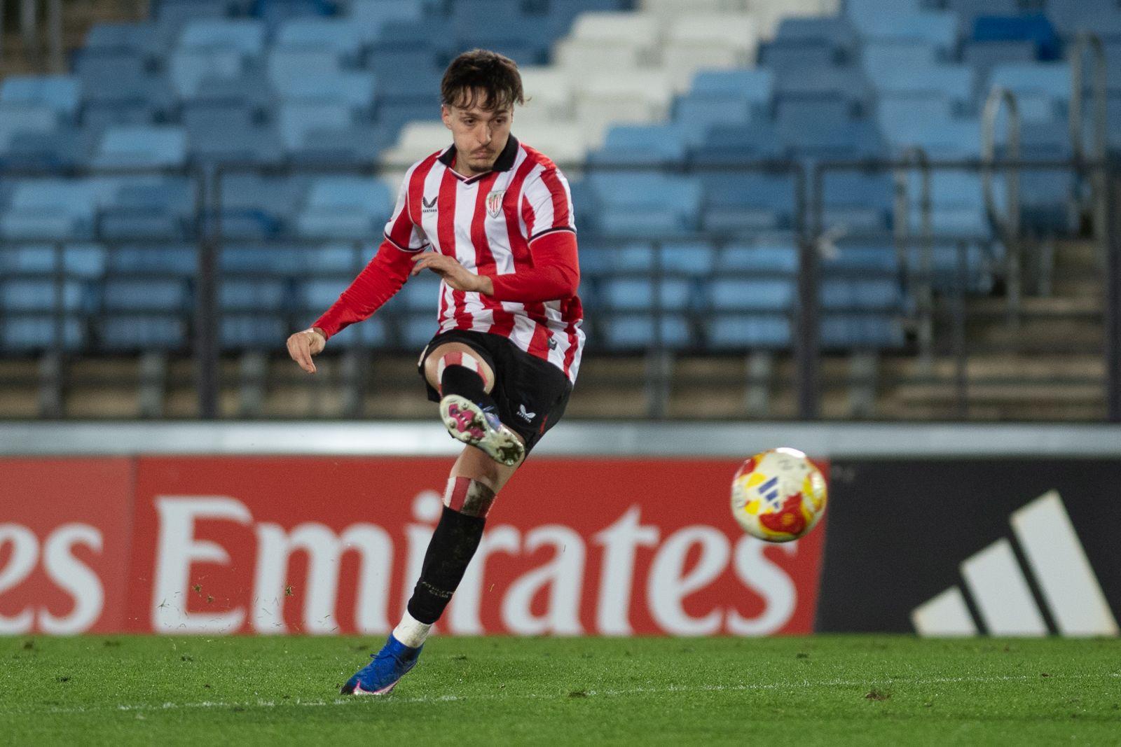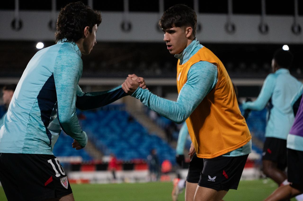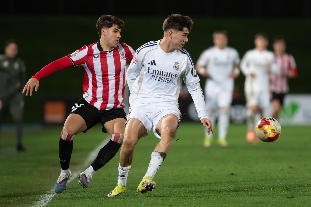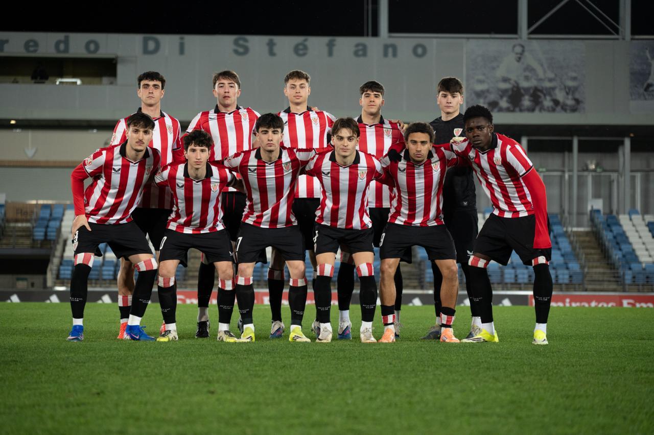 El Bilbao Athletic salió al césped del Alfredo Di Stéfano con un ritmo vertiginoso y fruto de la presión inicial, el encuentro comenzó de cara para los de Jokin Aranbarri. Eder García mandó un baló en profundidad para Gift, que cedió perfectamente un balón a la media luna donde apareció Ibon Sánchez para mandar un zurdazo a las redes madridistas. No obstante, en la primera jugada peligrosa para los locales, Pol Fortuny igualó la contienda después de recoger un rechace de una parada de Mikel Santos. El infortunio se cebó con el Bilbao Athletic, ya que tuvo que realizar un doble cambio durante la primera parte debido a las molestias de Duñabeitia e Ibon Sánchez. El cambio de este último dio pie para que Efe Korkut gozara de sus primeros minutos con la camiseta rojiblanca. Huestamendia tuvo una ocasión muy clara para hacer el segundo, pero Joan Martín sacó el balón sobre la línea de gol.