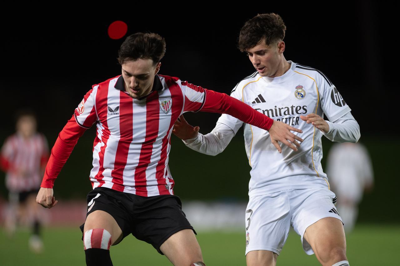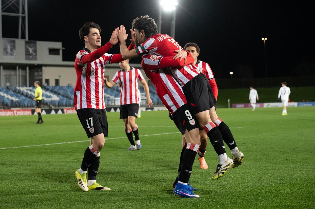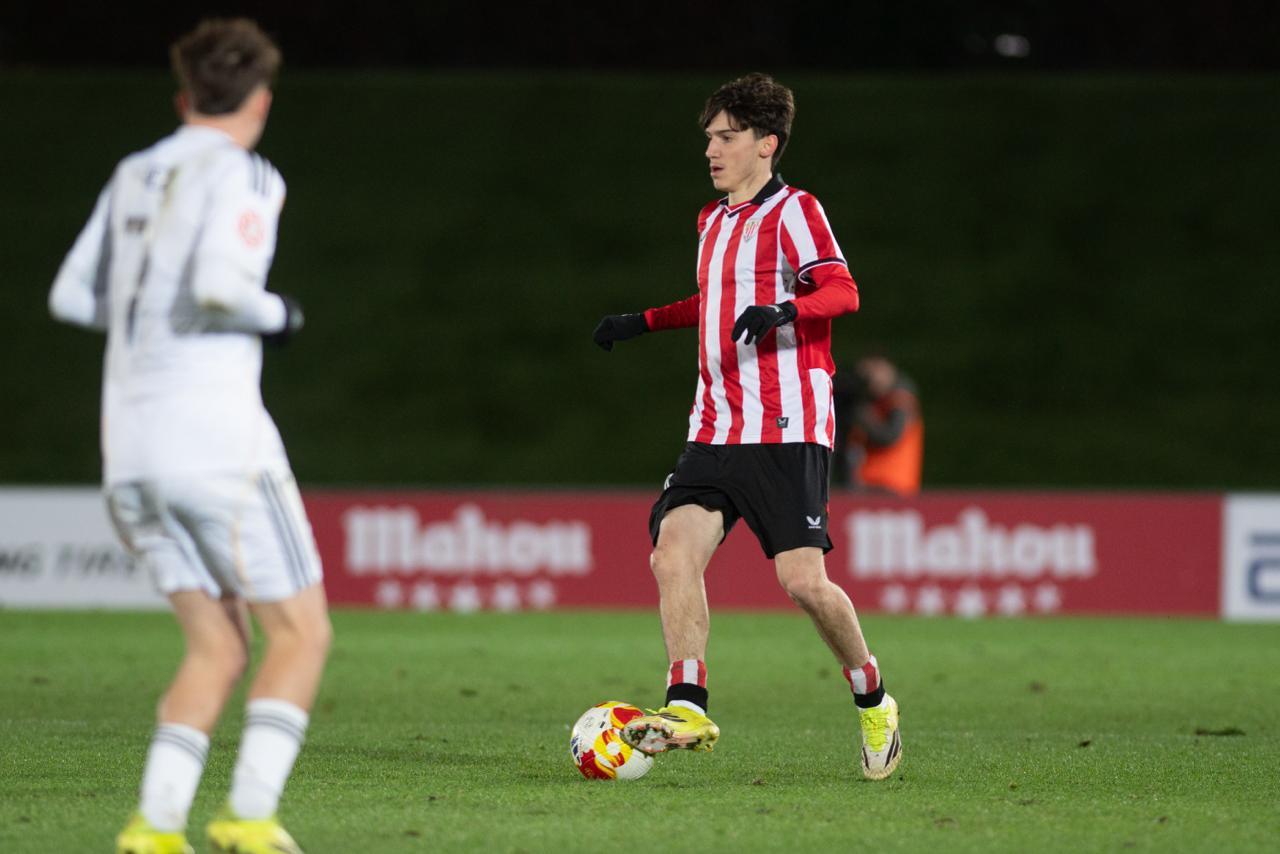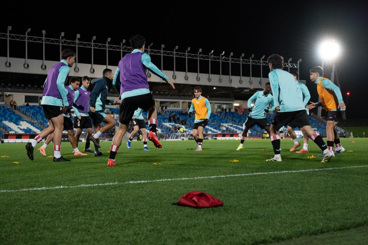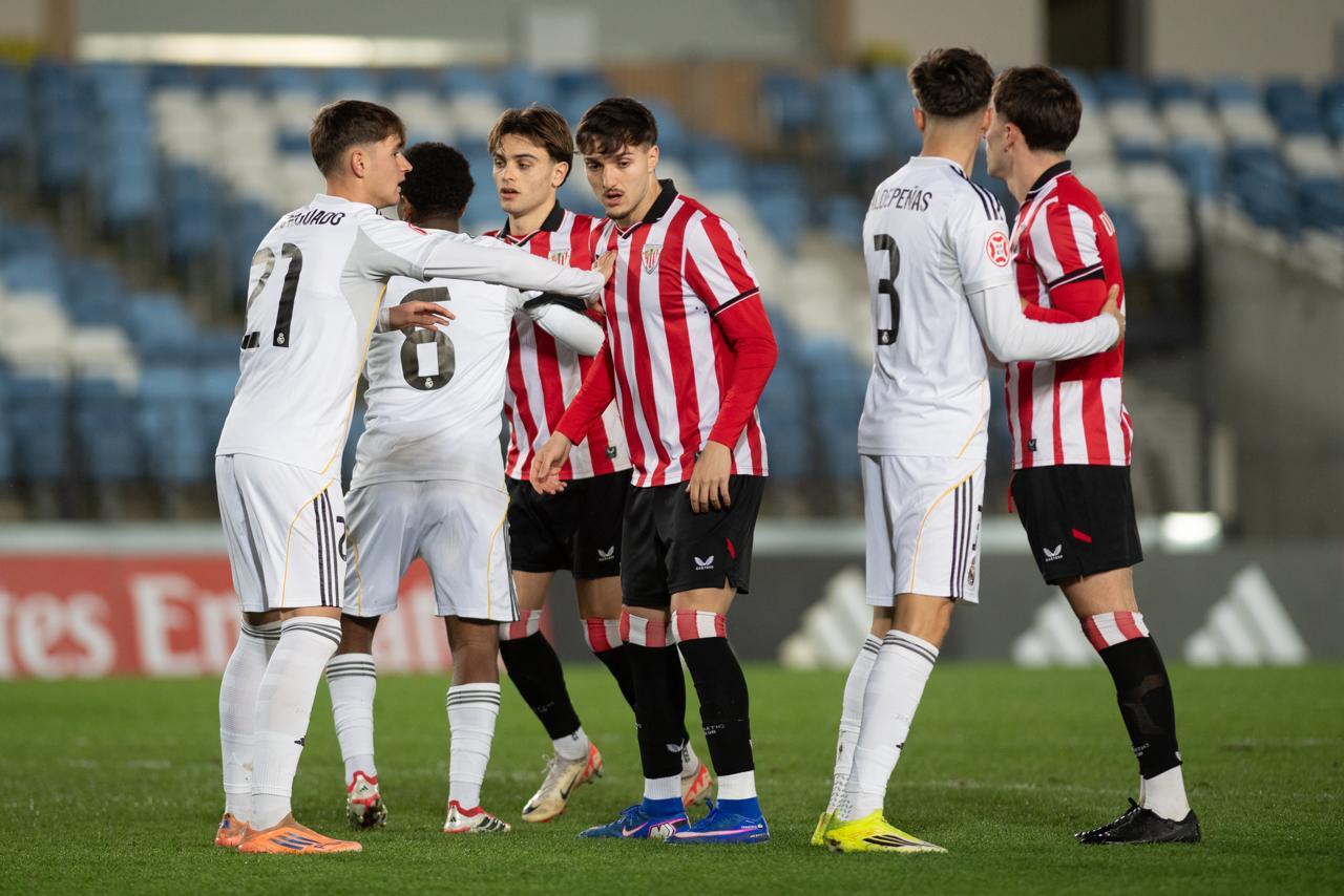 El Bilbao Athletic salió al césped del Alfredo Di Stéfano con un ritmo vertiginoso y fruto de la presión inicial, el encuentro comenzó de cara para los de Jokin Aranbarri. Eder García mandó un baló en profundidad para Gift, que cedió perfectamente un balón a la media luna donde apareció Ibon Sánchez para mandar un zurdazo a las redes madridistas. No obstante, en la primera jugada peligrosa para los locales, Pol Fortuny igualó la contienda después de recoger un rechace de una parada de Mikel Santos. El infortunio se cebó con el Bilbao Athletic, ya que tuvo que realizar un doble cambio durante la primera parte debido a las molestias de Duñabeitia e Ibon Sánchez. El cambio de este último dio pie para que Efe Korkut gozara de sus primeros minutos con la camiseta rojiblanca. Huestamendia tuvo una ocasión muy clara para hacer el segundo, pero Joan Martín sacó el balón sobre la línea de gol.