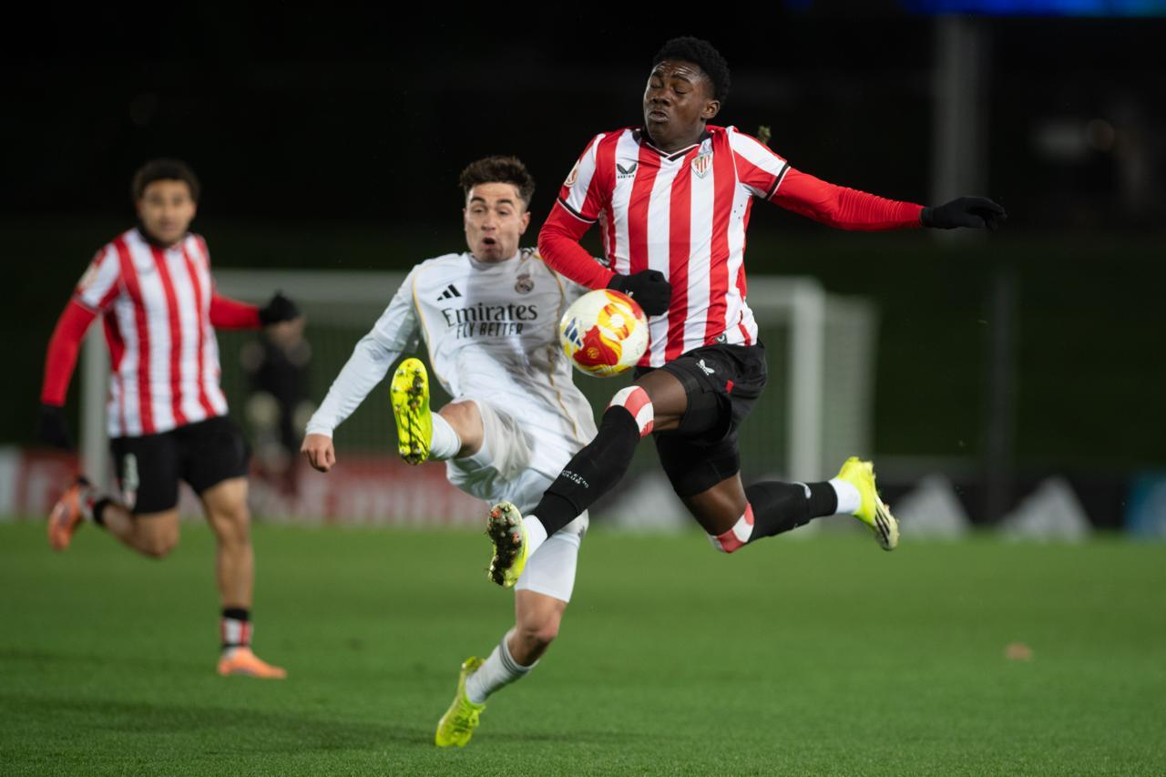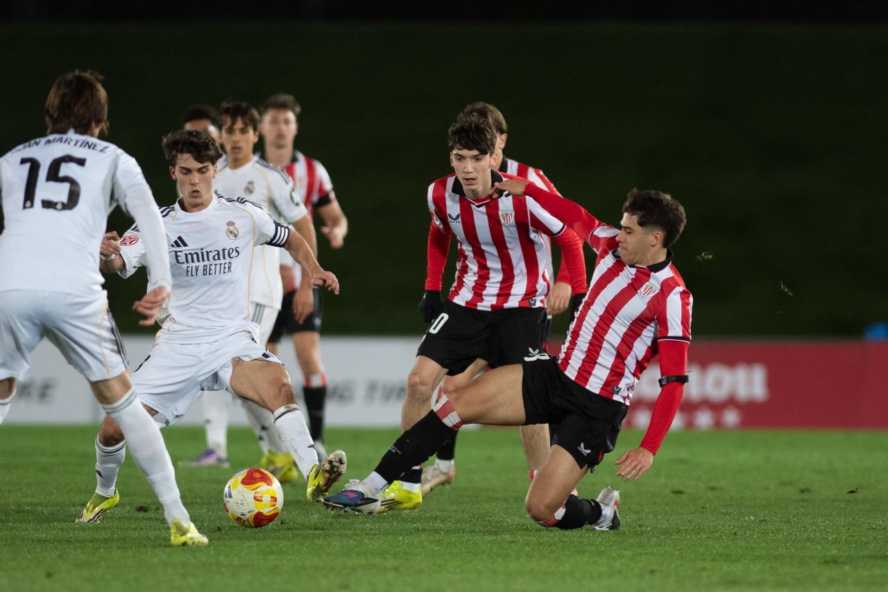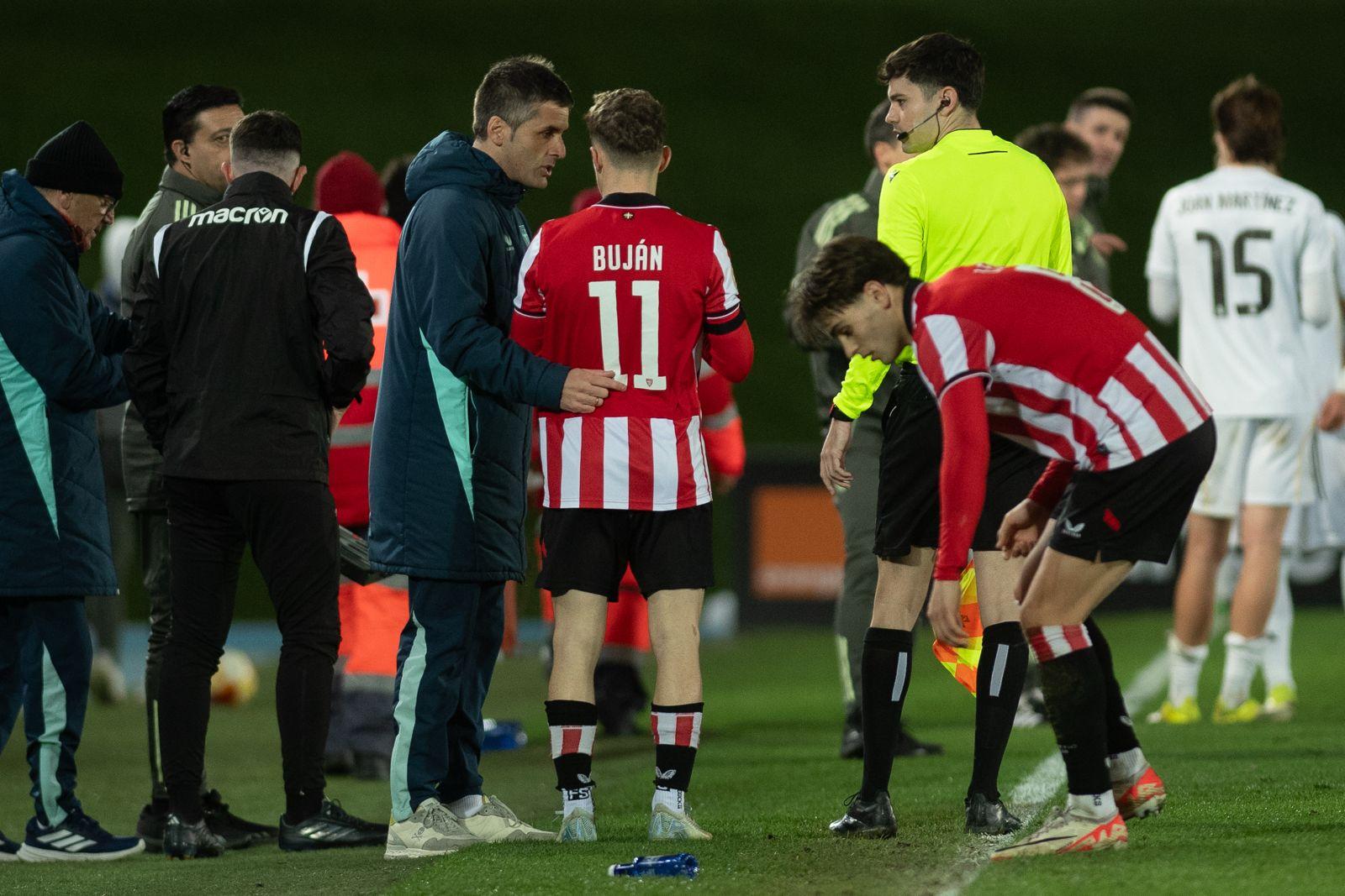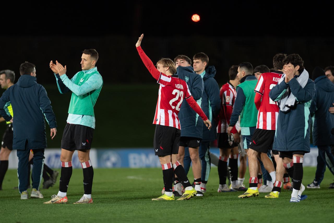 El Bilbao Athletic salió al césped del Alfredo Di Stéfano con un ritmo vertiginoso y fruto de la presión inicial, el encuentro comenzó de cara para los de Jokin Aranbarri. Eder García mandó un baló en profundidad para Gift, que cedió perfectamente un balón a la media luna donde apareció Ibon Sánchez para mandar un zurdazo a las redes madridistas. No obstante, en la primera jugada peligrosa para los locales, Pol Fortuny igualó la contienda después de recoger un rechace de una parada de Mikel Santos. El infortunio se cebó con el Bilbao Athletic, ya que tuvo que realizar un doble cambio durante la primera parte debido a las molestias de Duñabeitia e Ibon Sánchez. El cambio de este último dio pie para que Efe Korkut gozara de sus primeros minutos con la camiseta rojiblanca. Huestamendia tuvo una ocasión muy clara para hacer el segundo, pero Joan Martín sacó el balón sobre la línea de gol.