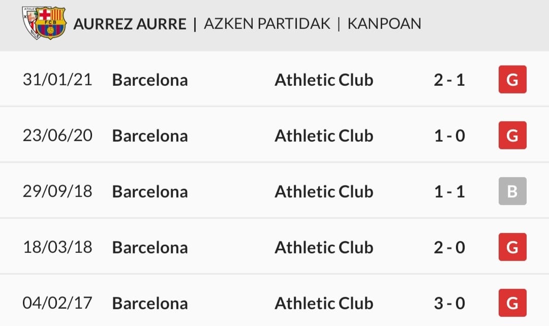LaLigan lehen aldiz jokatu zutenetik, 1928-29 denboraldian, FC Barcelonak eta Athletic Clubek 181 partida jokatu dituzte maila gorenean, eta balantze negatiboa izan dute zuri-gorriek: 60 aldiz irabazi dute, 31 berdindu eta 90 galdu.