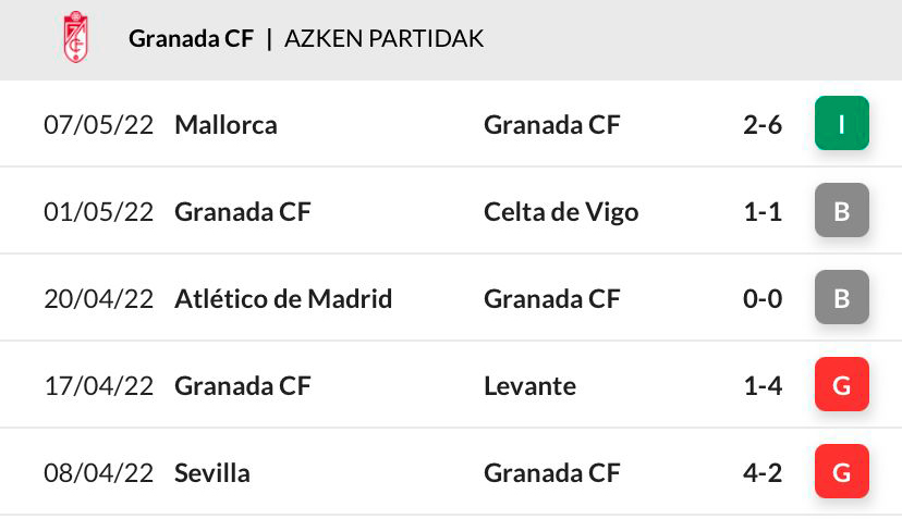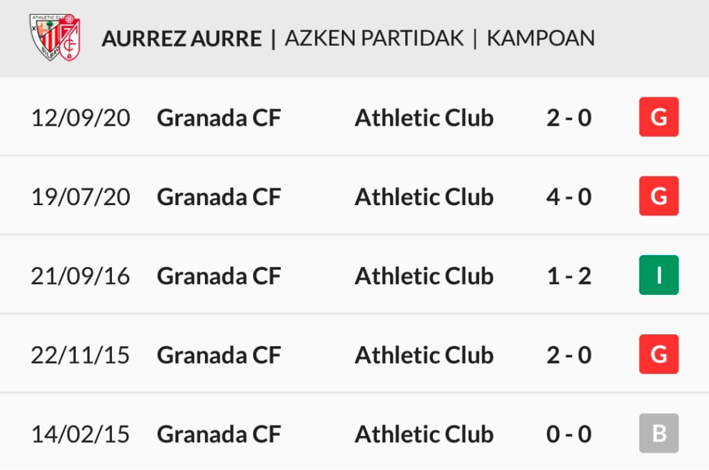 1941-42 denboraldian LaLigan jokatu zuten lehen partidatik 51 partida jokatu dituzte guztira Granadak eta Athleticek, eta egun balantze positiboa du talde zuri-gorriak: 26 garaipen, 12 berdinketa eta 13 porrot.