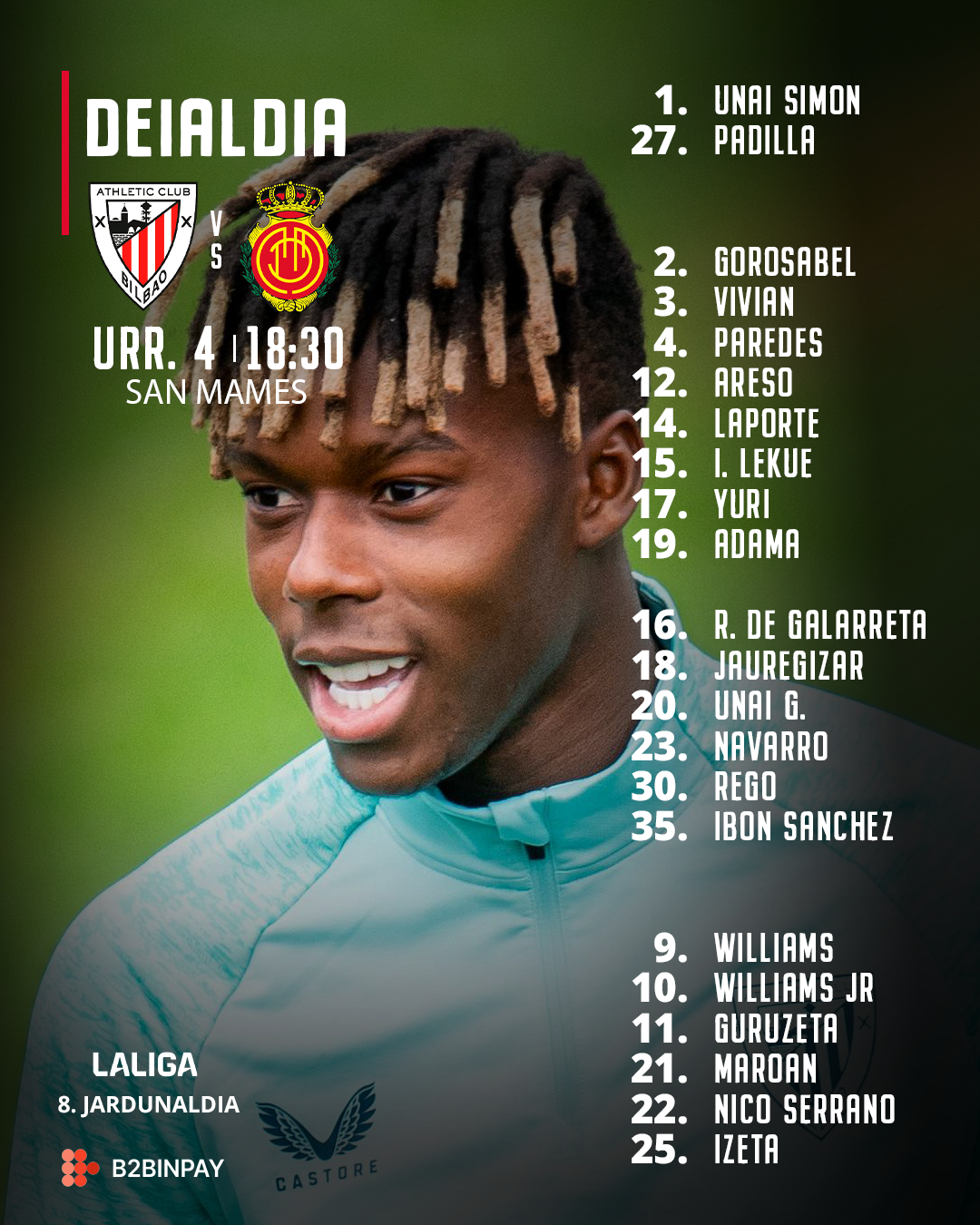 Unai Simon, Padilla, Gorosabel, Vivian, Paredes, Williams, Williams Jr, Guruzeta, Areso, Laporte, I. Lekue, Ruiz de Galarreta, Yuri, Jauregizar, Adama, Unai G., Maroan, Nico Serrano, Navarro, Izeta, Rego eta Ibon Sanchez.