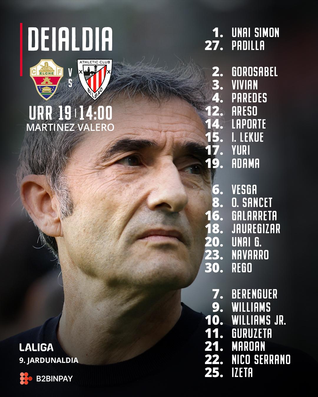 Ernesto Valverde Athletic Clubeko entrenatzaileak 24 jokalari deitu ditu Elche CF taldearen aurka jokatzeko, LaLiga EA Sports 2025/26 denboraldiko 9. jardunaldiko partidan, urriaren 19an, igandean, 14:00etatik aurrera, Martinez Valero zelaian.