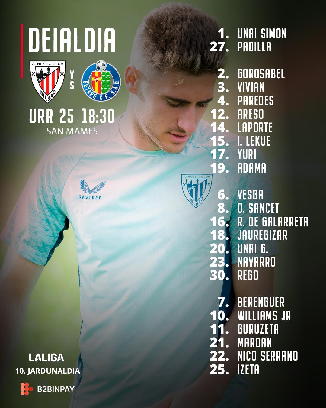 Ernesto Valverde Athletic Clubeko entrenatzaileak 23 jokalari deitu ditu Getafe CF taldearen aurka jokatzeko, LaLiga EA Sports 2025/26 denboraldiko 10. jardunaldiko partidan, urriaren 25an, larunbatean, 18:30etik aurrera, San Mamesen.