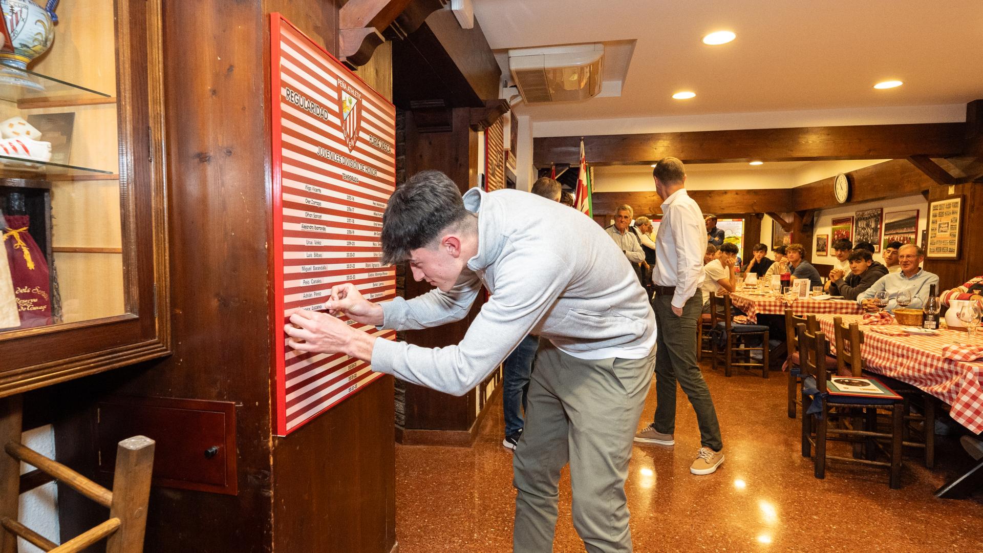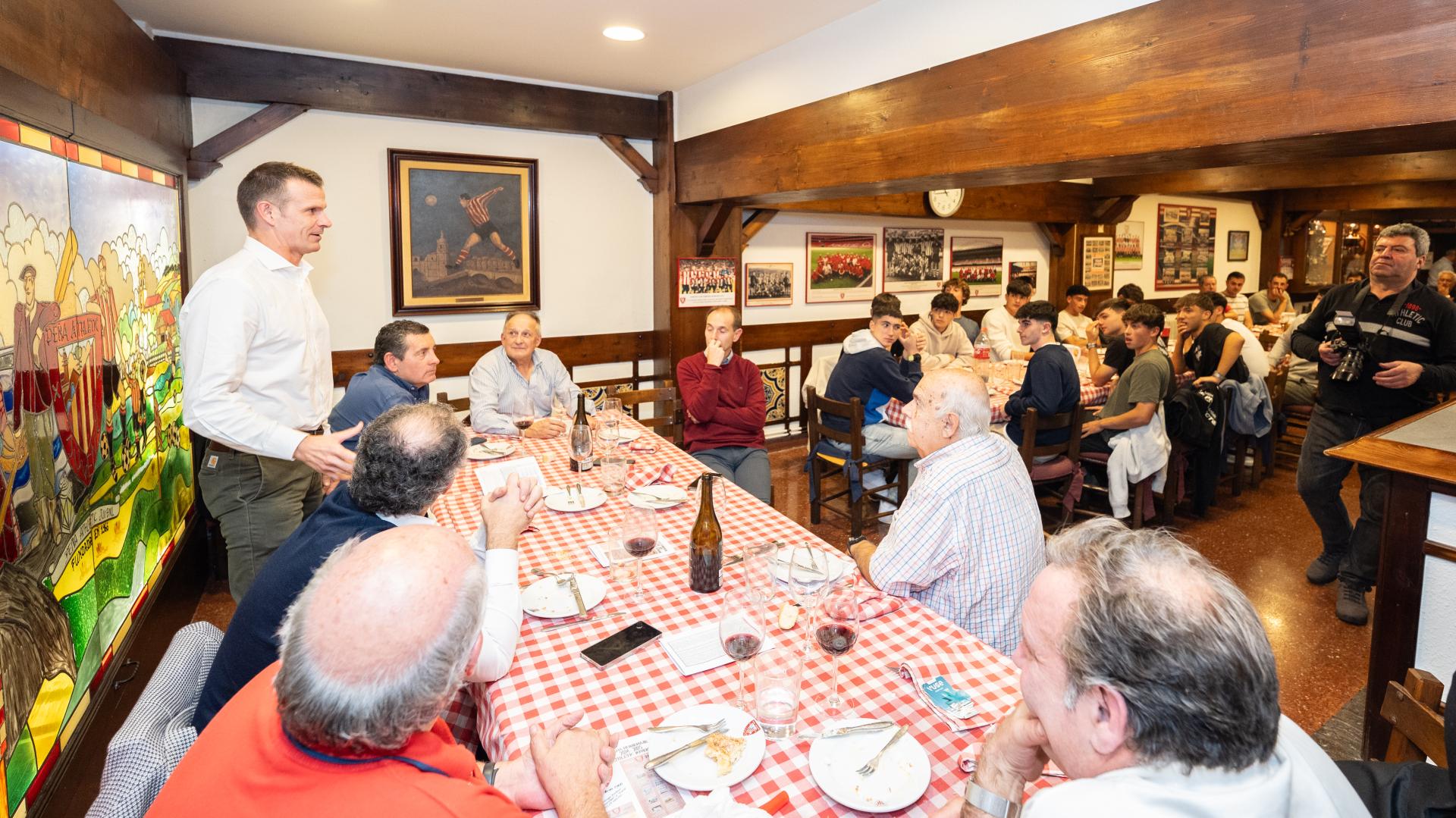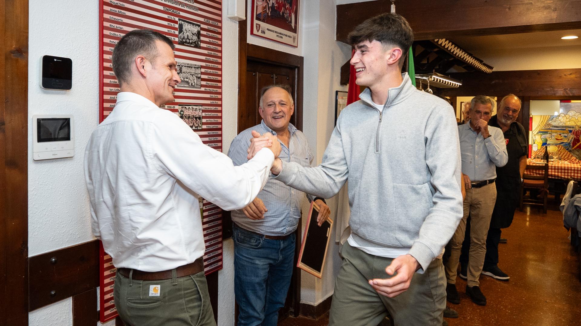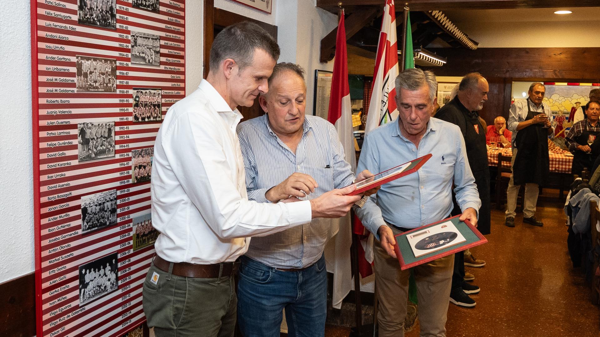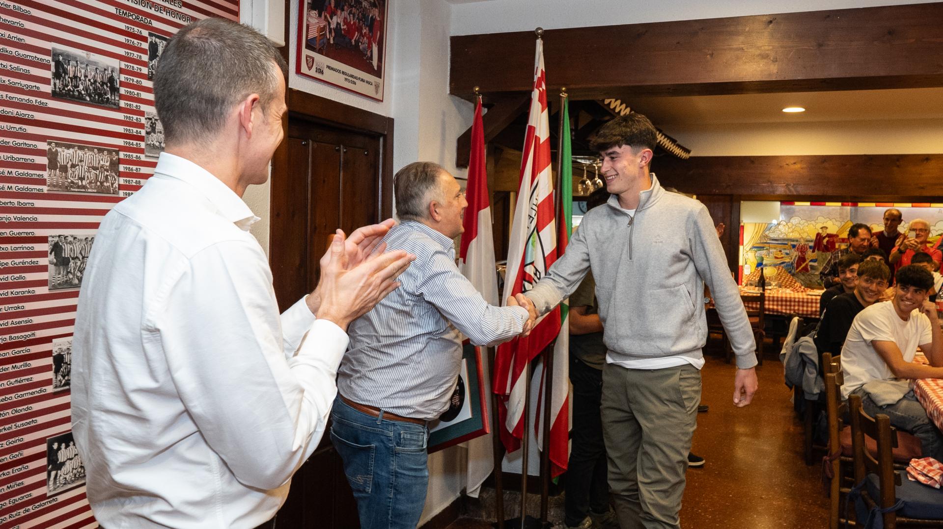 Manex Lozano aurrelari zuri-gorriak, 'Erregulartasuna' saria jaso du, eta Oier Unaumo atzelariak, 'Euskal Grina' saria. Jon Uriarte Athletic Clubeko presidentea, Lezamako Kirol Zuzendaritzako Xabi Alvarez eta Josetxu Urrutia batzarkideak eta Joseba Nuñez peñako presidentea izan dira omenaldian, joan den urteko talde horretako futbolari eta Adrian Estevek zuzentzen zuen talde tekniko guztiaekin batera.