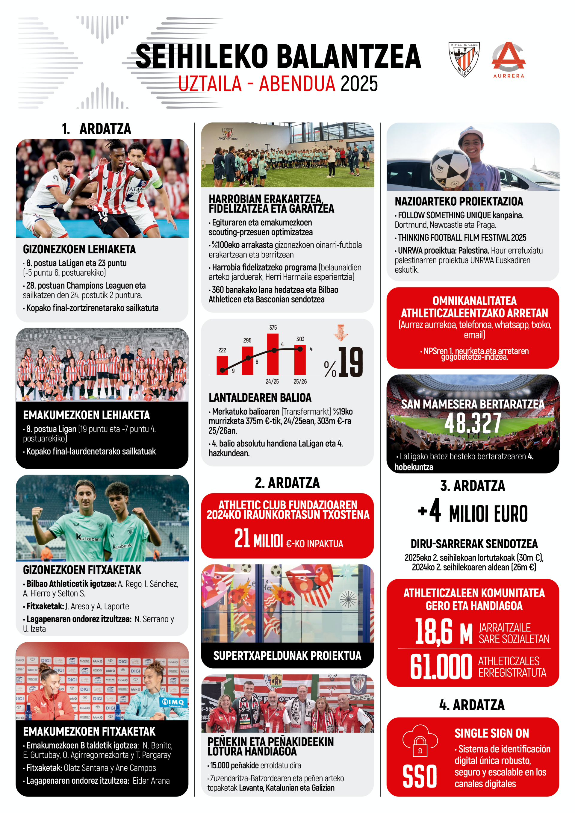 Athletic Clubek, bere bazkideekin hartutako konpromisoa betez, beste seihileko batez bere bazkideei webgunearen Txokoaren bidez jakinarazten die 2023/26 AC Aurrera Ekintza Planaren aurrerapenari buruzko guztia.