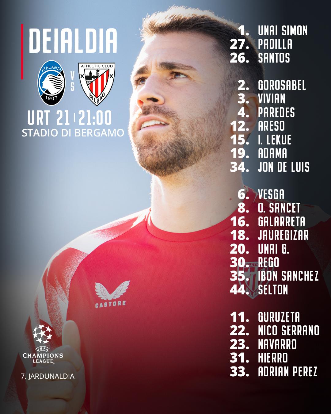Ernesto Valverde Athletic Clubeko entrenatzaileak 23 jokalari deitu ditu Atalanta BC taldearen aurka jokatzeko, Champions League 2025/26 denboraldiko 7. jardunaldiko partidan, urtarrilaren 21ean, asteazkenean, 21:00etatik aurrera, Stadio di Bergamo zelaian.