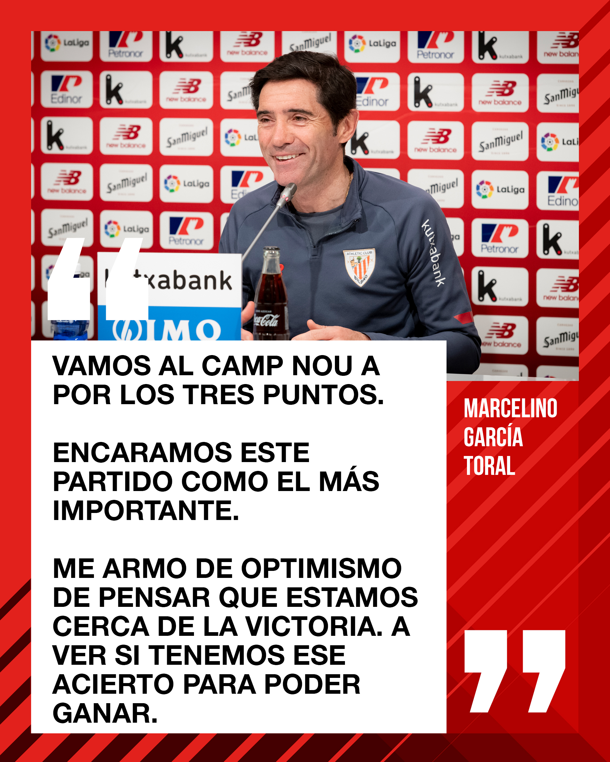 Después de la gran victoria en el derbi ante la Real Sociedad, el Athletic Club visita al FC Barcelona con la intención de seguir en la lucha por situarse en los puestos que dan acceso a las competiciones europeas. Un partido con historia entre dos equipos que nunca han descendido de categoría. Los leones son octavos con 37 puntos en la tabla a cinco de su rival de hoy. El conjunto blaugrana, ocupa la cuarta plaza de LaLiga con 42 puntos y un partido pendiente. El encuentro de hoy es importante para dar continuidad a las buenas sensaciones que está mostrando el equipo zurigorri en lo que llevamos de año, para recortar distancia en la clasificación y también para llegar lo mejor posible a la cita copera de la próxima semana en Mestalla, donde se verá las caras con el Valencia CF en la vuelta de semifinales.
