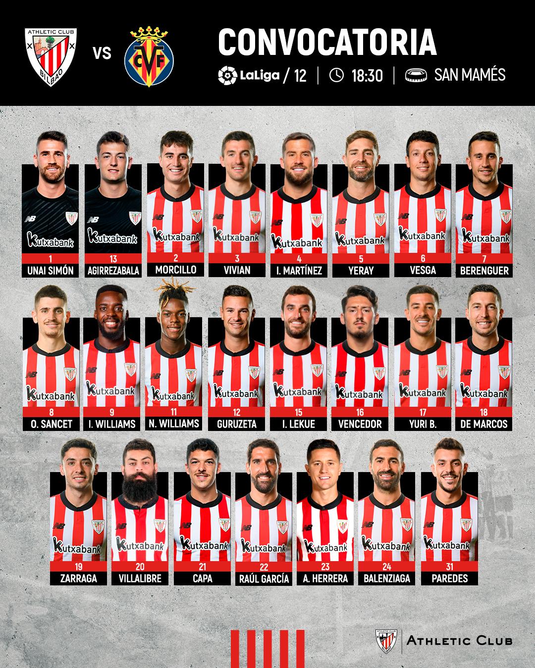El técnico zurigorri ha confeccionado la siguiente lista de futbolistas convocados para enfrentarse al Villarreal CF. Iker Muniain y Dani García causan baja por lesión y no estarán presentes en el choque en La Catedral. Por su parte, regresan a la lista Capa y Villalibre con respecto a la última citación.