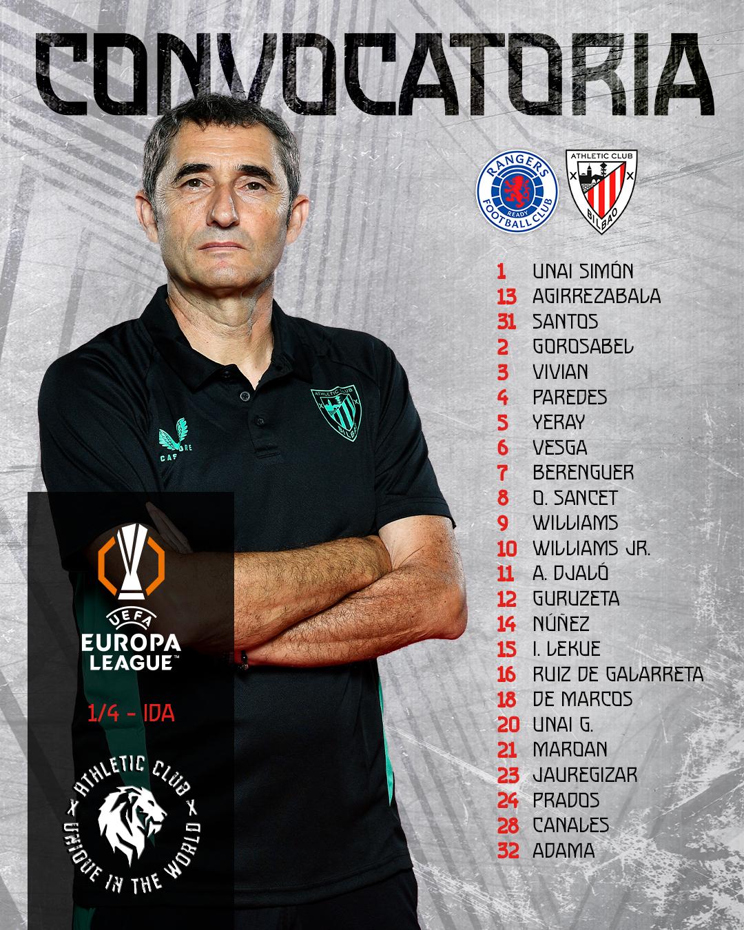 El entrenador del Athletic Club, Ernesto Valverde, ha convocado a 24 jugadores para enfrentarse al Rangers FC en el encuentro de ida de los cuartos de final de la UEFA Europa League que se disputará el jueves 10 de abril a las 21:00 horas en el Ibrox Stadium. Se espera que cerca de 2.600 athleticzales acompañen al equipo en la capital escocesa.