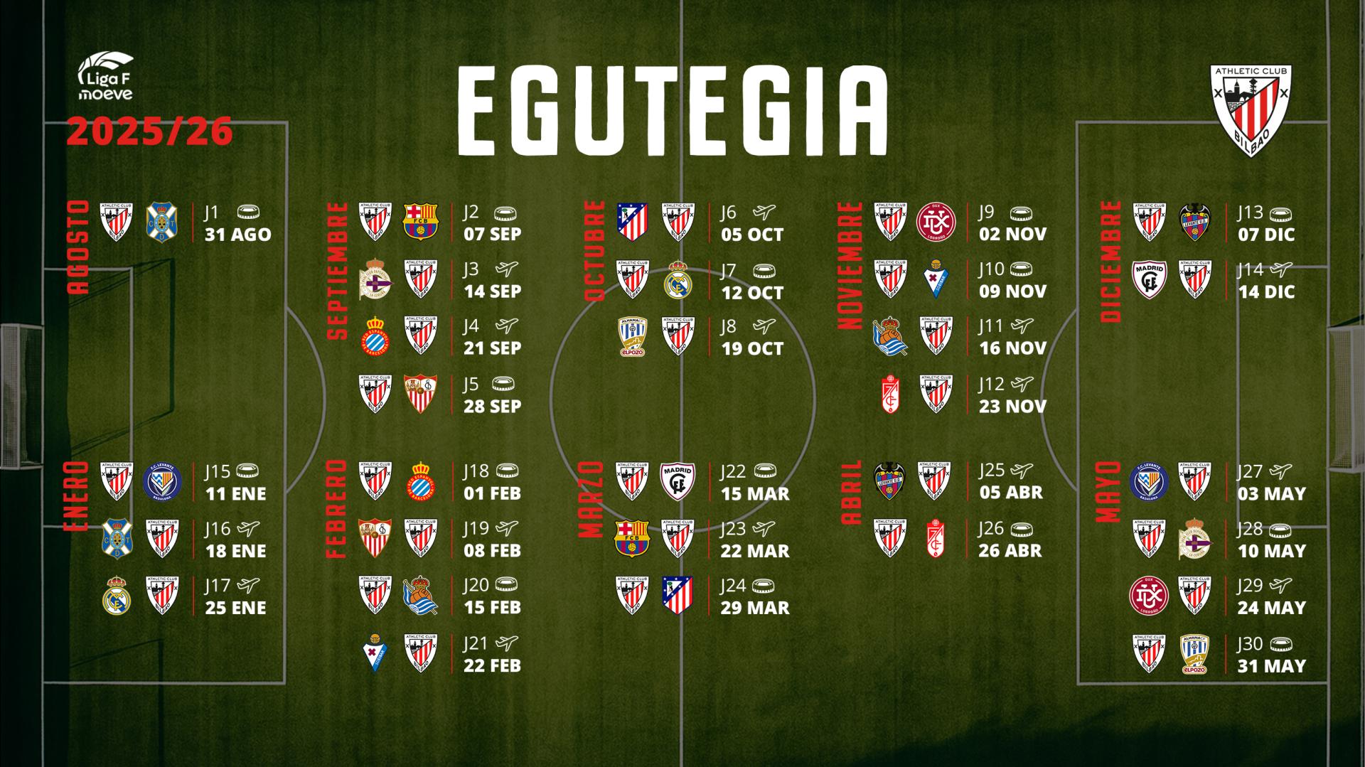 El Athletic Club ya conoce su calendario para la temporada 2025/26 de la Lifa F Moeve. Comenzará el nuevo curso ante el CD Costa Adeje Tenerife en Lezama el fin de semana del 31 de agosto. Por otra parte, las leonas cerrarán el campeonato el fin de semana del 31 de mayo ante el Alhama CF, también en casa.