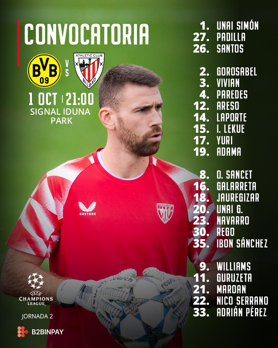 El entrenador del Athletic Club, Ernesto Valverde, ha convocado a 23 jugadores para enfrentarse al Borussia Dortmund en el encuentro correspondiente a la jornada 2 de Champions League 2025/26 que se disputará el miércoles, 1 de octubre, a partir de las 21:00 horas en el Signal Iduna Park.