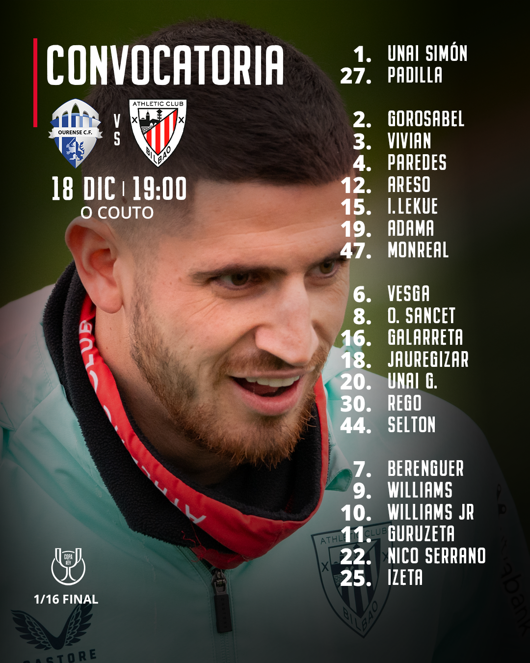 El entrenador del Athletic Club, Ernesto Valverde, ha convocado a 22 jugadores para enfrentarse al Ourense CF en el encuentro correspondiente los dieciseisavos de final de la Copa 2025/26 que se disputará el jueves, 18 de diciembre, a partir de las 21:00 horas, en O Couto.