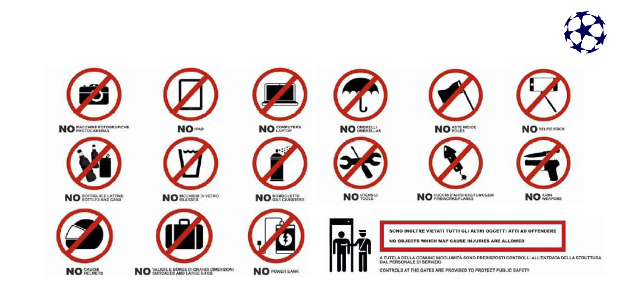 Objetos no permitidos: Cámaras de fotos, baterías portátiles, Ipads, ordenadores portátiles, paraguas, banderas con palo, palos selfi, botellas y latas, vidrios, pirotecnia, mochilas grandes...