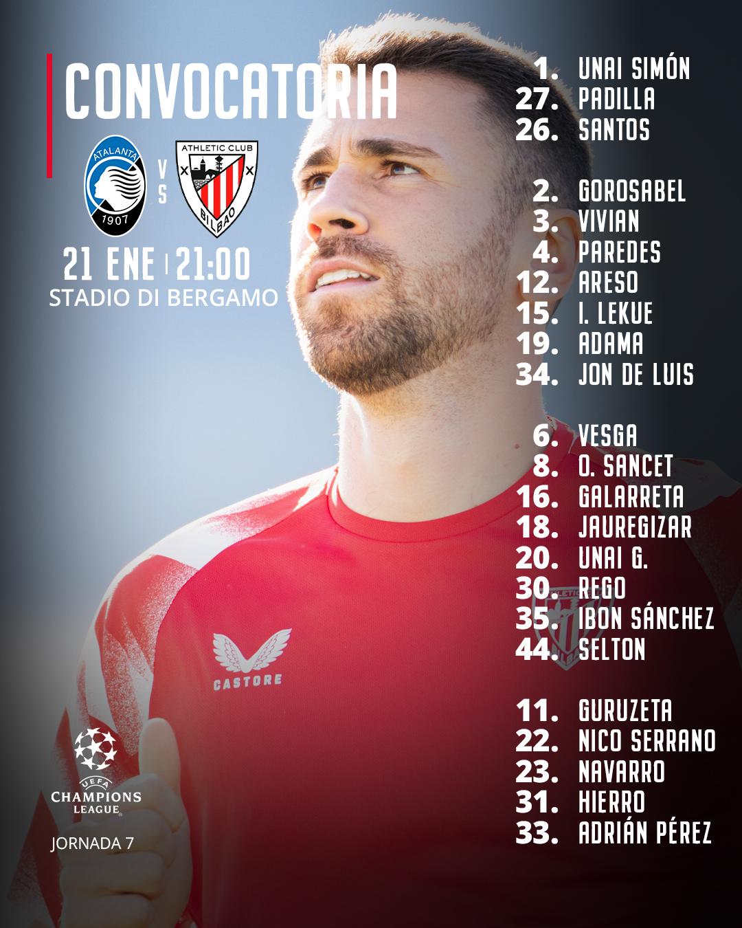 El entrenador del Athletic Club, Ernesto Valverde, ha convocado a 23 jugadores para enfrentarse al Atalanta BC en el encuentro correspondiente a la jornada 7 de Champions League 2025/26 que se disputará el miércoles, 21 de enero, a partir de las 21:00 horas, en el Stadio di Bergamo.