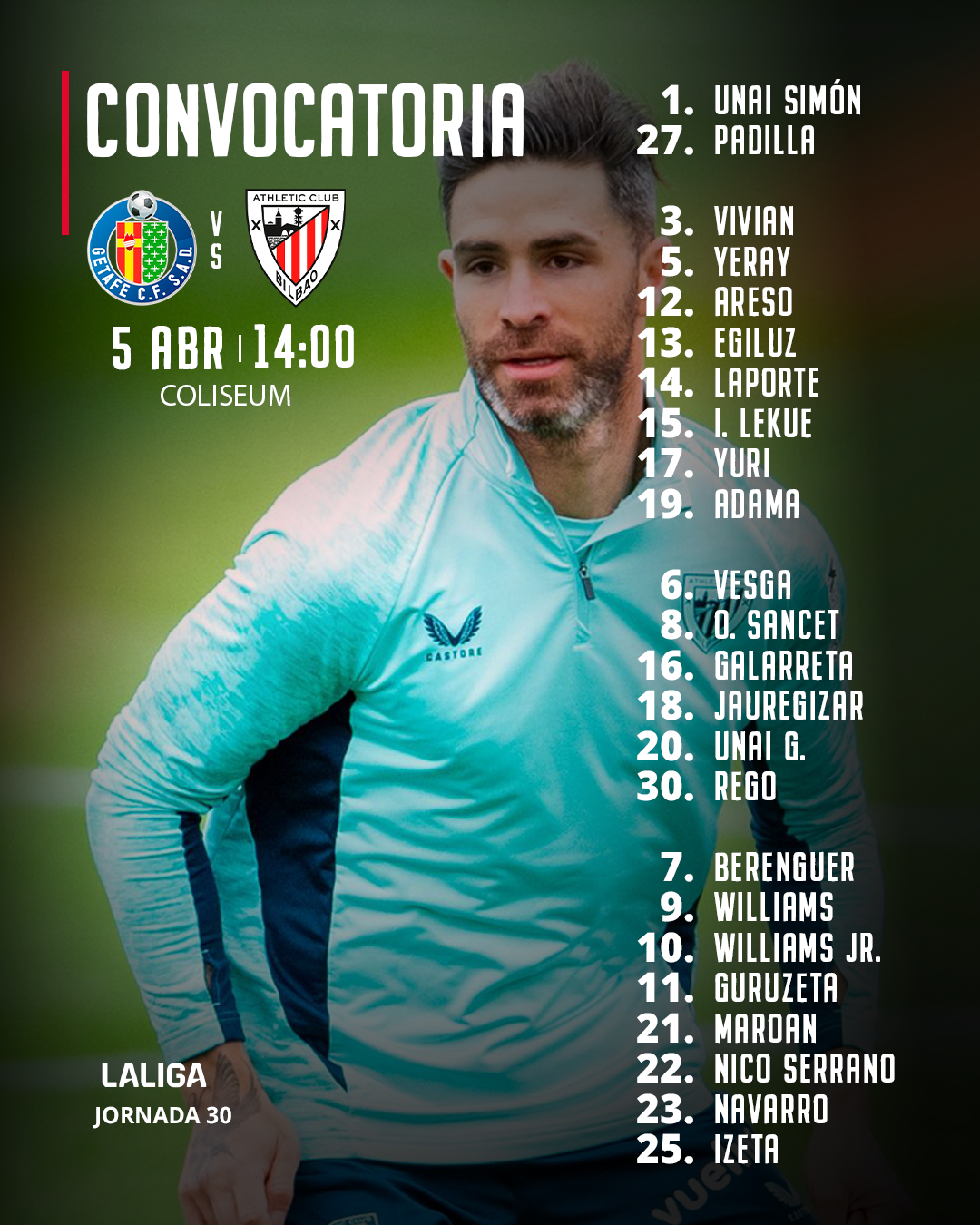 El entrenador del Athletic Club, Ernesto Valverde, ha convocado a 24 jugadores para enfrentarse al Getafe CF en el encuentro correspondiente a la jornada 30 de LaLiga EA Sports 2025/26 que se disputará el domingo, 5 de abril, a partir de las 14:00 horas, en el Coliseum.