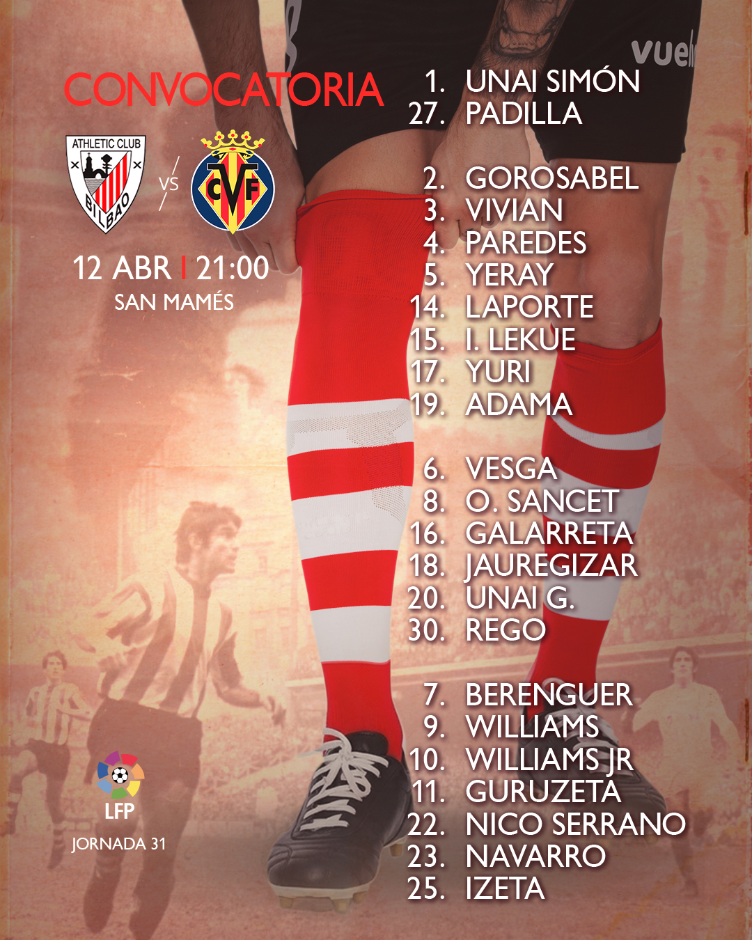 El entrenador del Athletic Club, Ernesto Valverde, ha convocado a 23 jugadores para enfrentarse al Villarreal CF en el encuentro correspondiente a la jornada 31 de LaLiga EA Sports 2025/26 que se disputará el domingo, 12 de abril, a partir de las 21:00 horas, en San Mamés.